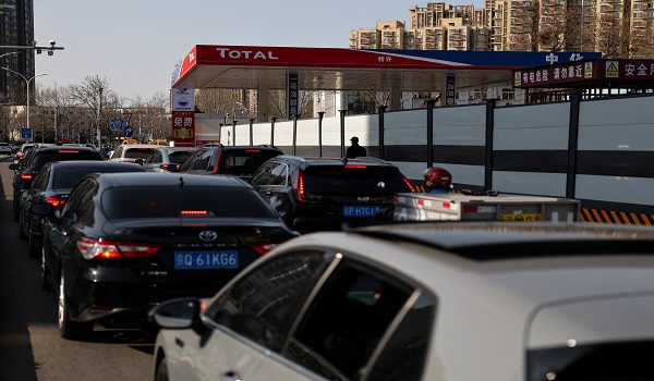 Kenderaan beratur di sebuah stesen minyak di Beijing,China menjelang kenaikan harga bahan api yang diumumkan di tengah konflik Asia Barat/ REUTERS
